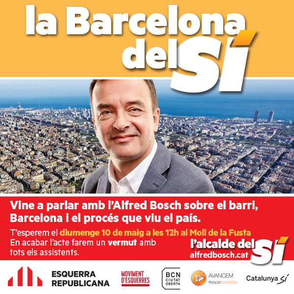 et convidem a assistir a l'acte a l'aire lliure que farem aquest diumenge 10 de maig amb Alfred Bosch, alcaldable d'ERC a Barcelona, a les 12h al Moll de la Fusta.