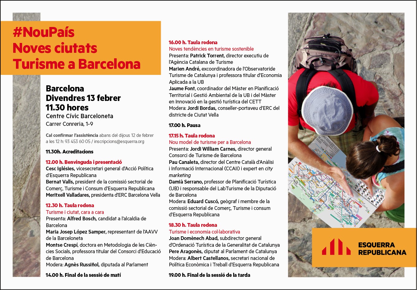 Et convidem a assistir a les Jornades de Turisme que farem el pròxim divendres 13 de febrer al Centre CÃvic Barceloneta (C/Conreria 1-9). Cal confirmar assistència abans del dijous 12 de febrer a les 12h. Podeu fer-ho trucant al 934536005 o bé enviant un e-mail a inscripcions@esquerra.org